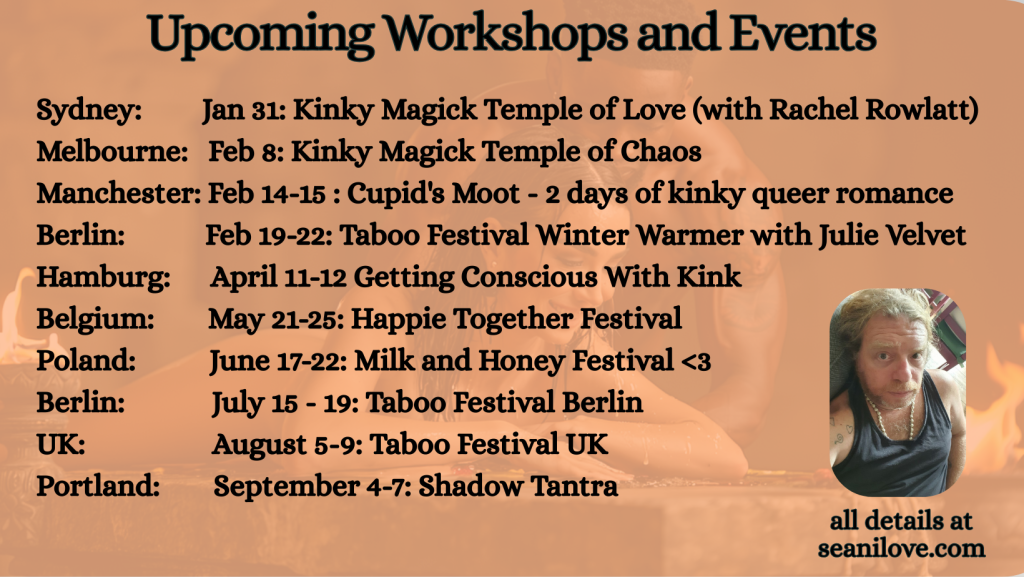 I’m Seani Love – a discreet, professional, fun-loving erotic and spiritual adventurer who works with erotic ritual, Neotantra, Conscious Kink and other forms of sacred sensuality.