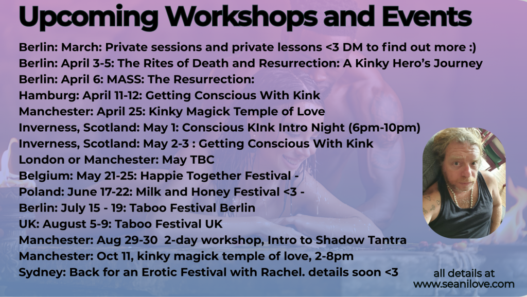 Berlin March: Private sessions and private lessons <3 Email me seani@seanilove.com to find out more 🙂 Berlin: April 3-5: The Rites of Death and Resurrection: A Kinky Hero’s Journey Berlin: April 6: MASS: The Resurrection: https://buytickets.at/schooloferoticmysteries/2072412 Hamburg: April 11-12: Getting Conscious With Kink: Manchester: April 25: Kinky Magick Temple of Love Inverness, Scotland: May 1-3: Conscious KInk weekend Belgium: May 21-25: Happie Together Festival Poland: June 17-22: Milk and Honey Festival <3 Berlin: July 15 – 19: Taboo Festival Berlin UK: August 5-9: Taboo Festival UK http://www.taboofest.love/ Manchester: Aug 29-30 2-day workshop, Intro to Shadow Tantra. let’s get skilled up! Manchester: Oct 11, kinky magick temple of love, 2-8pm, because temples are life Sydney, November 10-15: Secret Festival to be announced soon Sydney, December 12: Kinky Magick Temple of Chrimbo Loverama Sydney, January 19-24, Deep Dive, Save The Date! |