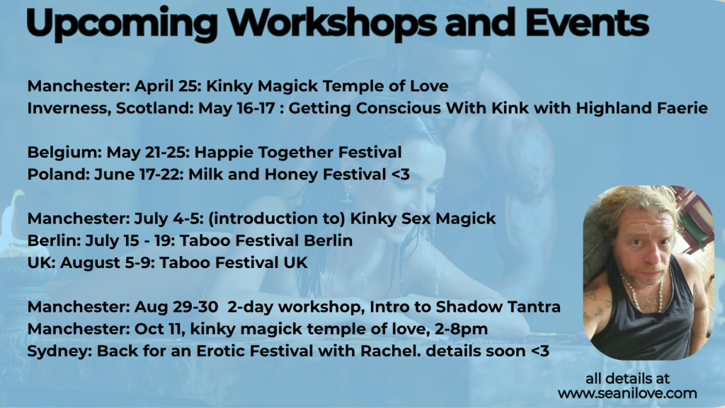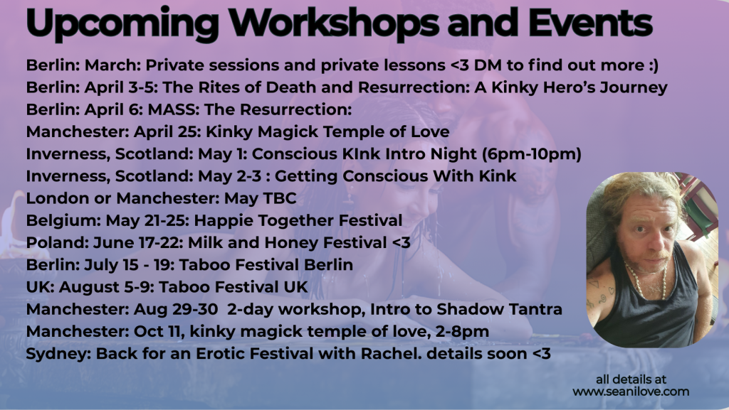 Berlin March: Private sessions and private lessons <3 Email me seani@seanilove.com to find out more 🙂 Berlin: April 3-5: The Rites of Death and Resurrection: A Kinky Hero’s Journey Berlin: April 6: MASS: The Resurrection: https://buytickets.at/schooloferoticmysteries/2072412 Manchester: April 25: Kinky Magick Temple of Love Inverness, Scotland: May 1-3: Conscious KInk weekend: https://www.tickettailor.com/events/schooloferoticmysteries/2091768