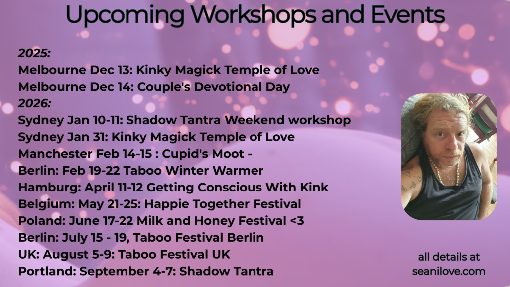 ![]() Hey lovely people, I’m super excited about all the upcoming events – Melbourne and Sydney for a few months then back to Europe for a new selection of special events. I’m feeling experimental and that might reflect in the experimental nature of the events I’m creating. Meanwhile, here’s the direct links to all my public events –> Melbourne Dec 13: Kinky Magick Temple of Love (with Nikkiema Rai) Melbourne Dec 14: Couple’s Devotional Day (with Nikkiema Rai) Sydney Jan 10-11: Shadow Tantra Weekend workshop (with Rachel Rowlatt – save the date!!) Sydney Jan 31: Kinky Magick Temple of Love (with Rachel Rowlatt – save the date!!) Manchester Feb 14-15 : Cupid’s Moot -> Valentine’s Most Loving Conscious Kink Weekend Berlin: Feb 19-22: Taboo Festival Winter Warmer (with Julie Velvet) Hamburg: April 11-12 Getting Conscious With Kink – save the date! Belgium: May 21-25: Happie Together Festival Poland: June 17-22: Milk and Honey Festival <3 Berlin: July 15 – 19: Taboo Festival Berlin (now at a new venue! ) UK: August 5-9: Taboo Festival UK (tickets on sale soon) Portland: September 4-7: Shadow Tantra: Getting Conscious With Kink (with Emerald May) |