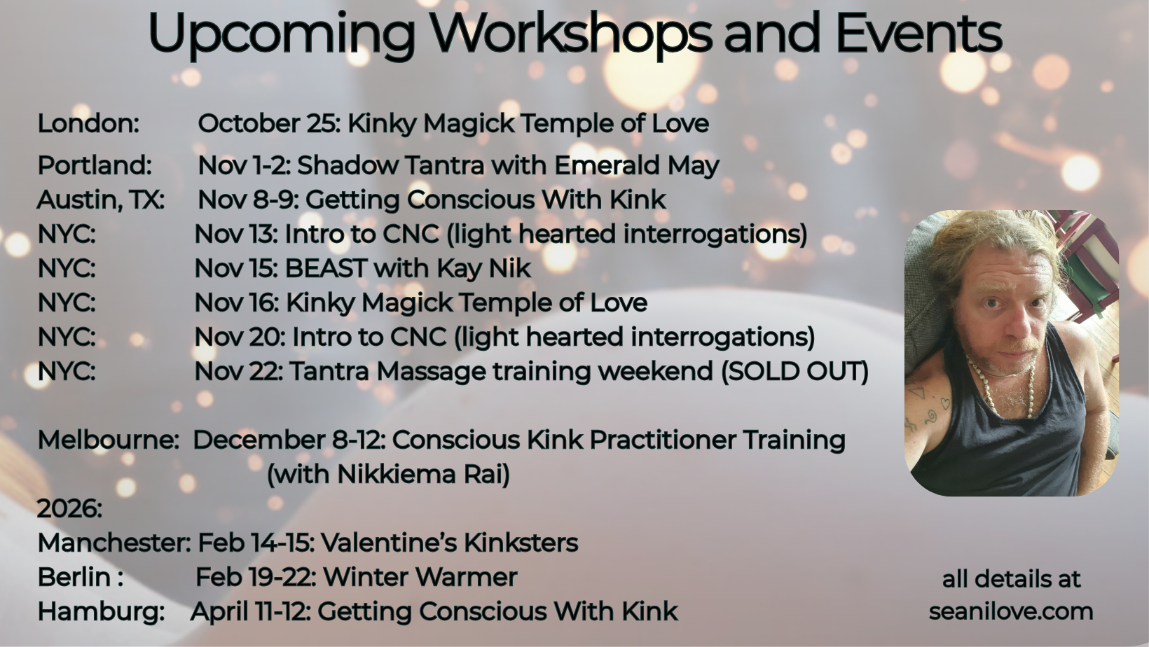 ![]() Hey lovely people, I’m super excited about all the upcoming events – London, Manchester, Berlin, Amsterdam and back to the USA, woo! What I’m most excited about is my 2–month course for practitioners: Level Up Pro I’ve run this course 4 times in the past and have helped MANY great people become practitioners and level up in their sex-positive businesses. Maybe I can help you too? This begins October 1st so get in quick. Meanwhile, here’s the direct links to all my public events –> London: October 25: Kinky Magick Temple of Love -> https://buytickets.at/schooloferoticmysteries/1855546 Portland: Nov 1-2: Shadow Tantra with Emerald May -> https://events.humanitix.com/shadow-tantra-with-seani-love-and-emerald-may-pdx Austin, TX: Nov 8-9 Getting Conscious With Kink -> https://events.humanitix.com/shadow-tantra NYC: NOV 13: Intro to CNC: Light-hearted introductions -> https://www.eventbrite.com/e/hands-on-intro-to-cnc-lighthearted-interrogations-tickets-1829442595049?aff=oddtdtcreator NYC: Nov 15: BEAST with Kay Nik -> https://events.humanitix.com/going-deeper-with-conscious-k-nk-beast NYC: NOV 16: Kinky Magick Temple Of Love (DM for link) NYC: NOV 20: Level 2 CNc: Darker Interrogations: -> https://www.eventbrite.com/e/level-2-cnc-darker-interrogations-tickets-1830414301449?aff=oddtdtcreator NYC: Nov 22-23: Tantric Bodywork workshop (sold out) Melbourne: December 8-12: Conscious Kink Practitioner Training – (with Nikkiema Rai) – https://forms.gle/22GWMAcubxqRDZix9 2026 Manchester Feb 14-15 : Cupid’s Moot -> Valentine’s Most Loving Conscious Kink Weekend Berlin: Feb 19-22 Taboo Winter Warmer – save the date! Hamburg: April 11-12 Getting Conscious With Kink – save the date! July 15 – 19, 2026 Taboo Festival Berlin !!! |